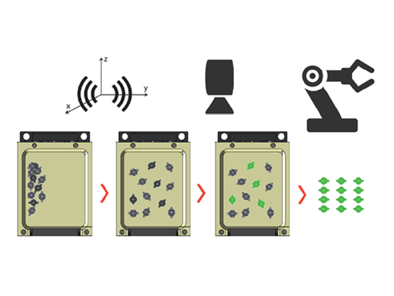The resonance principle is used to achieve the process of moving materials in a certain direction to form an arrangement by using the resonance principle for fine parts with complex geometric shapes, sensitive materials and surfaces that are vulnerable, or with sizes of several millimeters or smaller, and the visual system is used to judge and position the product posture. Give the coordinate data to the robot, and the robot will grab based on the coordinate data. The bottom CCD will take pictures for secondary positioning. The robot will perform accuracy compensation and then perform array placement, palletizing or assembly operations as required.